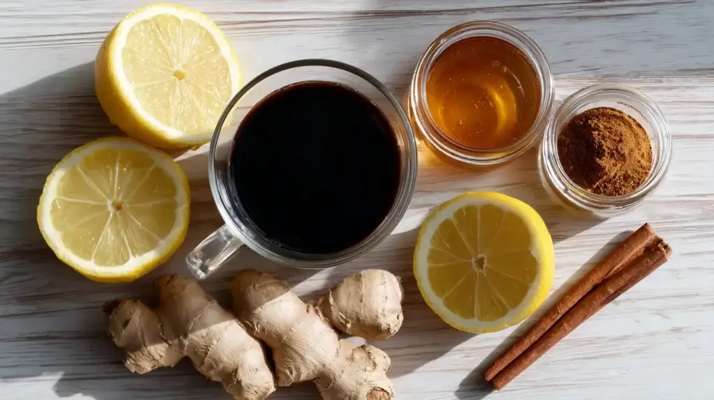 A wellness-boosting morning drink combining coffee, ginger, lemon, and honey to awaken your body and support digestion.